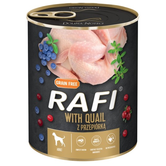 Tym, co wyróżnia mokrą karmę Rafi z przepiórką, jest wysoka zawartość białka o bogatym składzie aminokwasowym (fenyloalanina i cystyna). Mięso i surowce pochodzące z przepiórki, a szczególnie jej tłuszcz, są źródłem cennych wielonienasyconych kwasów tłuszczowych z rodziny n-6, które regulują szereg funkcji organizmu. Dodatkowo dostarczają potasu i miedzi, które warunkują prawidłową pracę układu nerwowego. Tymianek, dzięki zawartości olejków i substancji biologicznie czynnych, działa relaksacyjnie na mięśniówkę przewodu pokarmowego i stymuluje wydzielanie soków trawiennych. Co więcej, wpływa na zwiększenie walorów smakowych karmy. Borówka amerykańska i żurawina wzbogacają skład o szereg witamin i składników odżywczych.