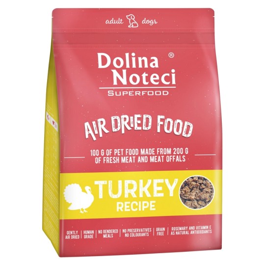 Dolina Noteci SUPERFOOD danie z indyka to pokrywająca w 100% dzienne zapotrzebowanie na wszystkie składniki odżywcze, pełnowartościowa karma suszona, przeznaczona dla dorosłych psów wszystkich ras. Urozmaicony i wartościowy skład obejmuje 80% świeżego mięsa i produktów pochodzenia zwierzęcego z indyka, wołowiny, kurczaka i wieprzowiny, które są źródłem białka o bardzo wysokiej strawności, bogatym we wszystkie niezbędne aminokwasy. Innowacyjna metoda produkcji polegająca na delikatnym suszeniu mięsa i produktów pochodzenia zwierzęcego oraz odpowiednim doborze surowców sprawia, że karma jest lekkostrawna i dopasowana do wymogów żywieniowych dorosłych psów. Proces suszenia ciepłym powietrzem pozwala na wyprodukowanie 100 g karmy z aż 200 g mięsa i podrobów, zachowując przy tym jej smakowitość oraz potrzebne składniki odżywcze. Dobór surowców bogatych w różnego rodzaju tkanki: mięśniową, łączną oraz serca, zapewnia zarówno różnorodność składników pokarmowych, jak i tekstur, które w najefektywniejszy sposób stymulują procesy trawienne. Dolina Noteci SUPERFOOD danie z indyka zawiera owoce i warzywa takie jak: marchew, szpinak, borówki, maliny, żurawinę, pomidor, pomarańcze, groszek, jagody goji, które są cennym uzupełnieniem codziennej diety w mikroskładniki oraz istotnie wpływają na przewód pokarmowy dorosłego psa. W skład karmy wchodzą również: siemię lniane, jukka Mojave oraz wodorosty morskie, które wspomagają prawidłowe funkcjonowanie układu pokarmowego, a także rozmaryn wykazujący właściwości przeciwutleniające. Drożdże piwne suszone oraz inulina z cykorii są natomiast źródłem prebiotyków, które wspierają utrzymanie prawidłowej flory jelit. Zarówno skład karmy suszonej, jak i jej konsystencja, gwarantują wysoką smakowitość. Przestrzeganie zalecanej ilości podawanej psu karmy nie powoduje ryzyka powstania nadwagi czy otyłości. Dobrym uzupełnieniem diety opartej na karmie suszonej jest podawanie psu świeżej wody do picia, która w sposób naturalny wspomaga przyswajanie składników w niej zawartych.