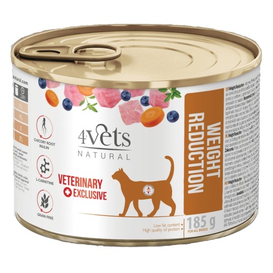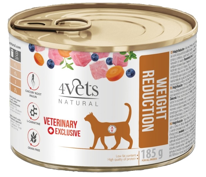 Dieta weterynaryjna 4vets Weight Reduction to pełnoporcjowa dietetyczna karma dla kotów zalecana do stosowania w przypadku wystąpienia nadwagi i otyłości oraz po zabiegu sterylizacji w celu profilaktyki rozwoju nadwagi i otyłości. Dieta dzięki niskiej zawartości tłuszczu oraz zawartości L-karnityny wspomaga proces odchudzenia. Podwyższona ilość błonnika niweluje uczucie głodu.