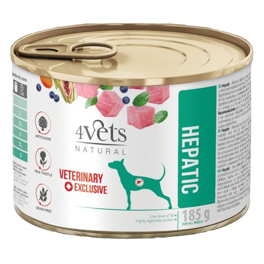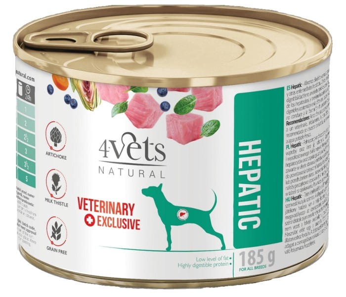 Dieta weterynaryjna 4vets Hepatic to pełnoporcjowa specjalistyczna karma dla psów cierpiących na niewydolność wątroby oraz inne jej schorzenia. Ograniczona podaż wysokiej jakości białka wpływa korzystnie na funkcjonowanie wątroby i regenerację hepatocytów oraz zapobiega zanikowi tkanki mięśniowej. Wysokostrawne węglowodany zawarte w diecie stanowią niebiałkowe źródło energii, których metabolizm nie prowadzi do powstawania toksycznych produktów przemiany białkowej.