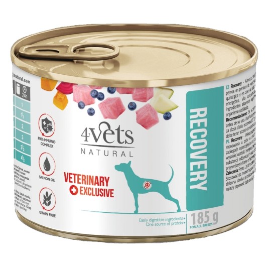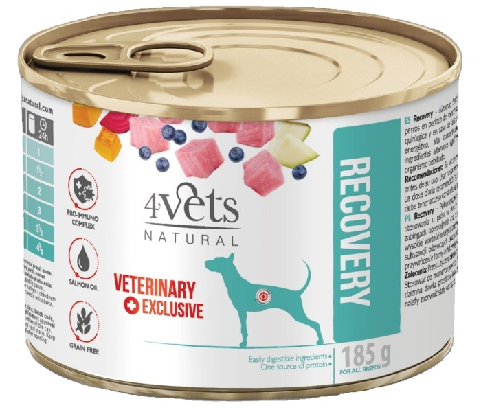 Dieta weterynaryjna 4Vets Natural Recovery to pełnoporcjowa dietetyczna karma mokra zalecana do stosowania u psów w okresie rekonwalescencji, po przebytych zabiegach operacyjnych oraz w celu stymulacji apetytu. Dzięki odpowiedniej gęstości energetycznej oraz zawartości podstawowych składników odżywczych o wysokich współczynnikach strawności wspiera regenerację osłabionego organizmu.