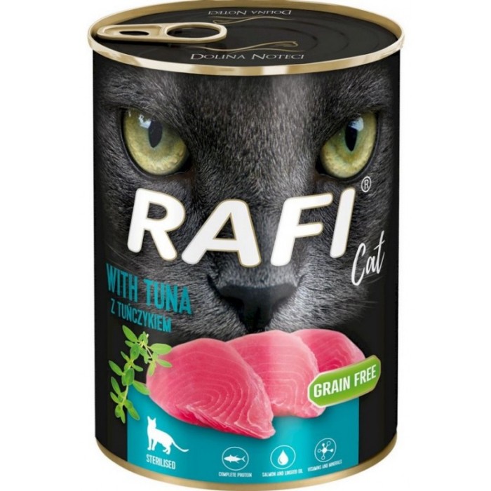 mięso i produkty pochodzenia zwierzęcego 45%, ryby i produkty rybne 10% (mięso z tuńczyka 4%), oleje i tłuszcze (olej lniany 0,6%, olej z łososia 0,5%), produkty pochodzenia roślinnego (w tym skrobia grochowa), substancje mineralne, tymianek suszony 0,01%.