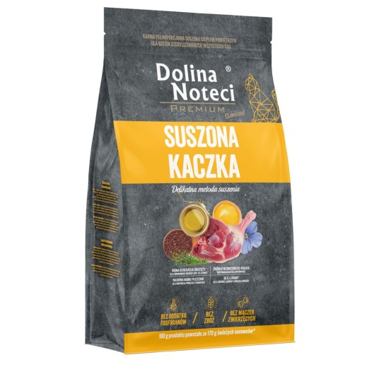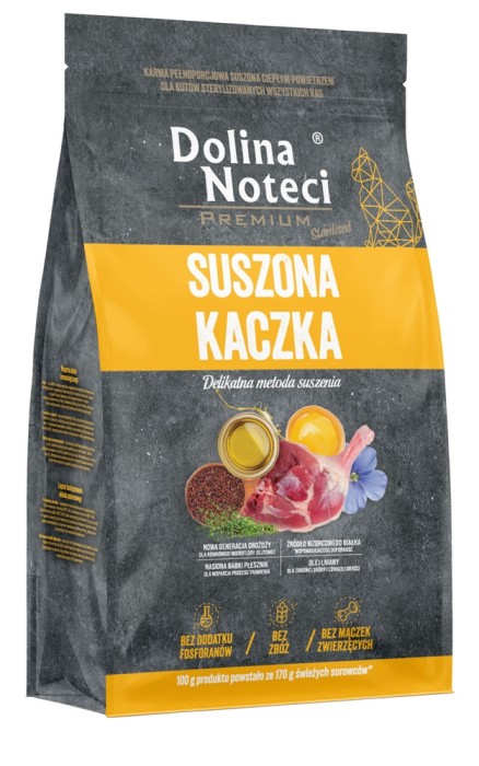 Pełnoporcjowa, wyjątkowo smaczna, suszona delikatnym strumieniem ciepłego powietrza – taka właśnie jest karma Dolina Noteci Premium suszona kaczka dla dorosłych kotów sterylizowanych wszystkich ras.