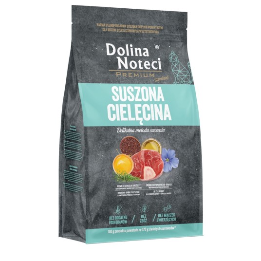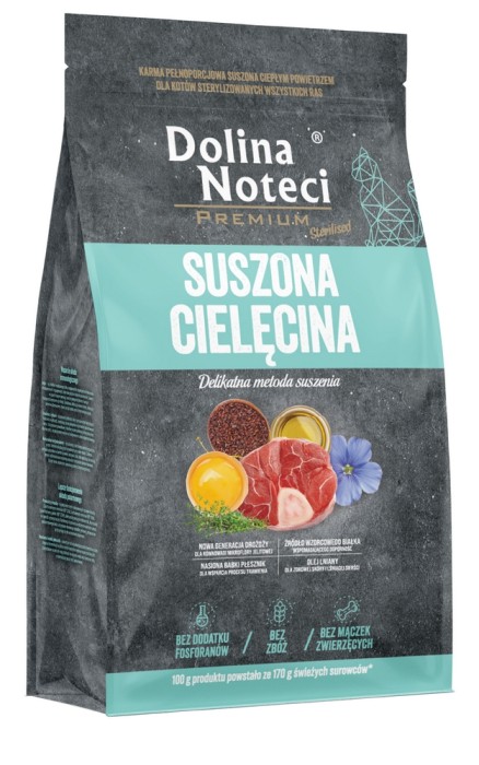 Karma Dolina Noteci Premium suszona cielęcina to pełnoporcjowy produkt, który zaspokaja potrzeby żywieniowe dorosłych kotów sterylizowanych, uwzględniając ich ograniczone przemiany metaboliczne. Podstawę karmy stanowią w 80% mięso i podroby z wysokim udziałem tkanki mięśniowej z cielęciny, wieprzowiny i dorsza.